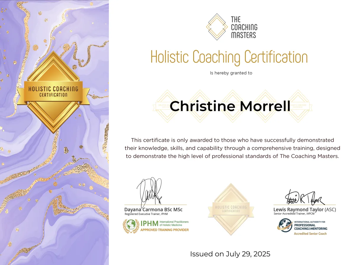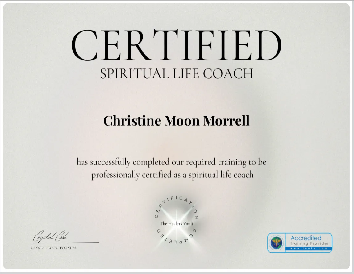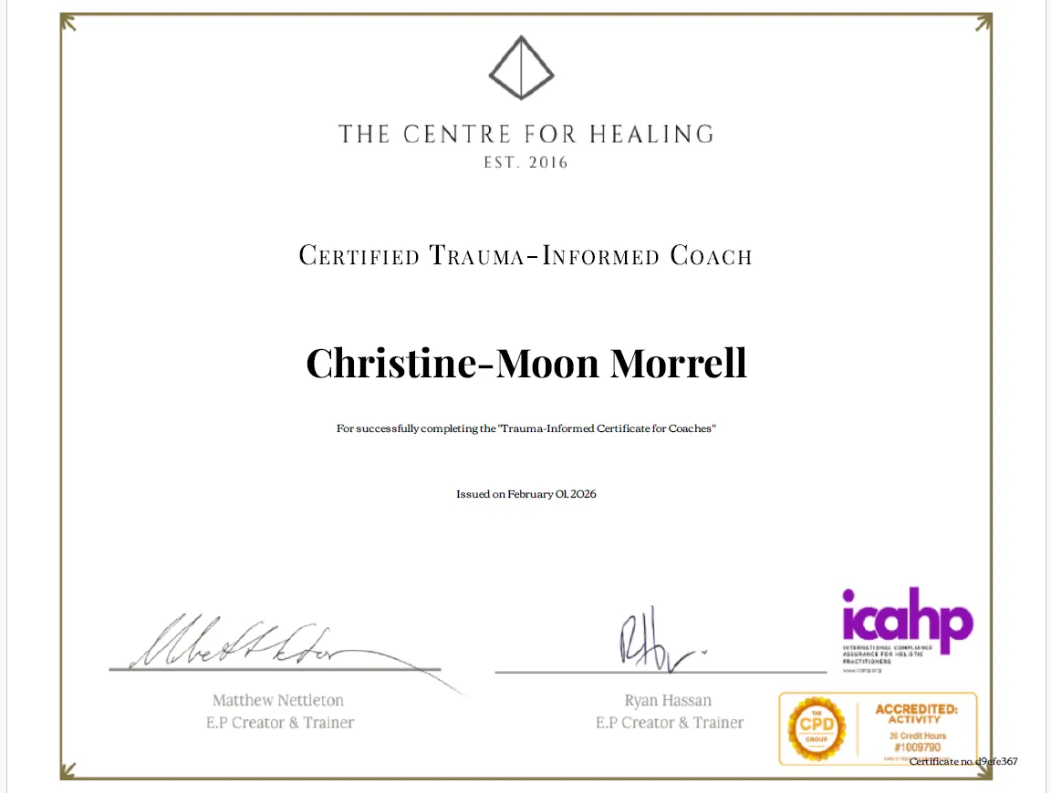 Christine Moon Morrell is a Trauma-Informed Certified Life Coach devoted to helping high-achieving women move beyond trauma-driven proving and into embodied, sovereign power.